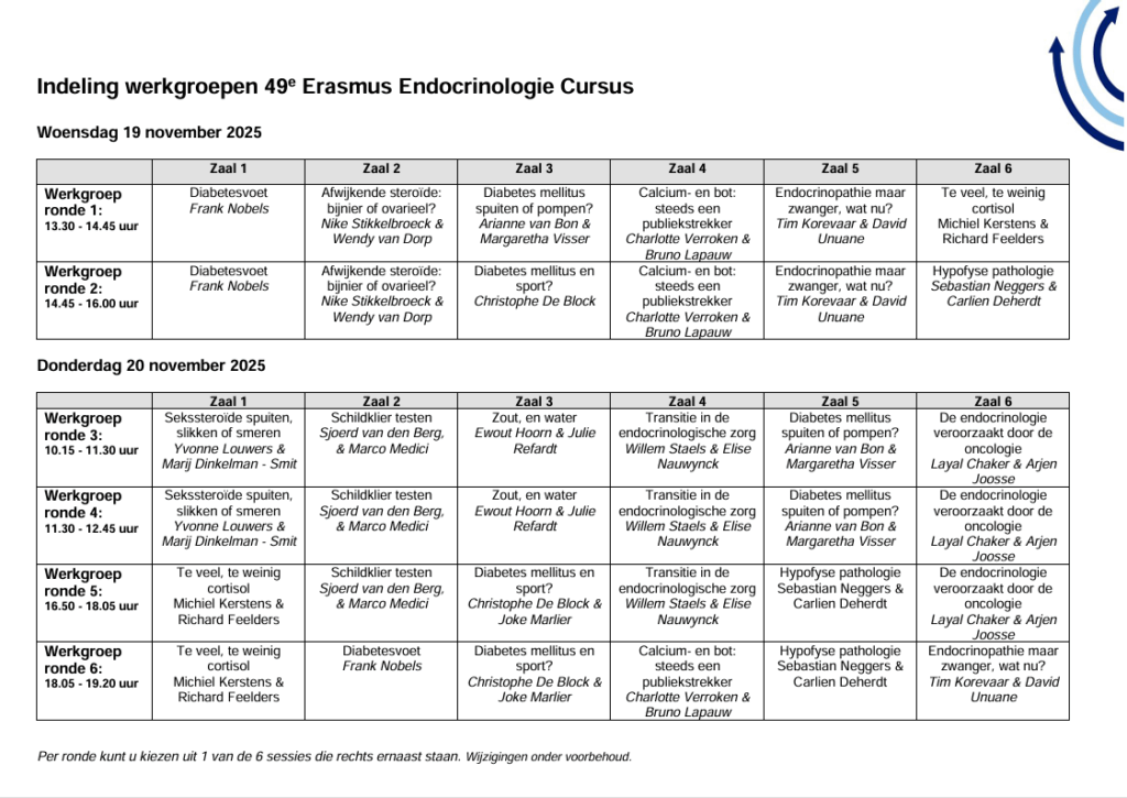 Bij het registeren kunt u per ronde een keuze maken. U volgt dus 6 werkgroepen in totaal. Onderaan deze lijst met werkgroepen staan de indelingen per ronde.
